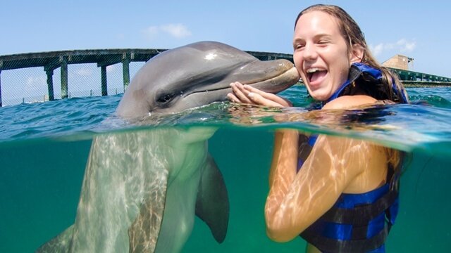 You will be greeted with a dolphin “pec shake” and it will not take long before you will be able to experience the magic of a dolphin kiss.